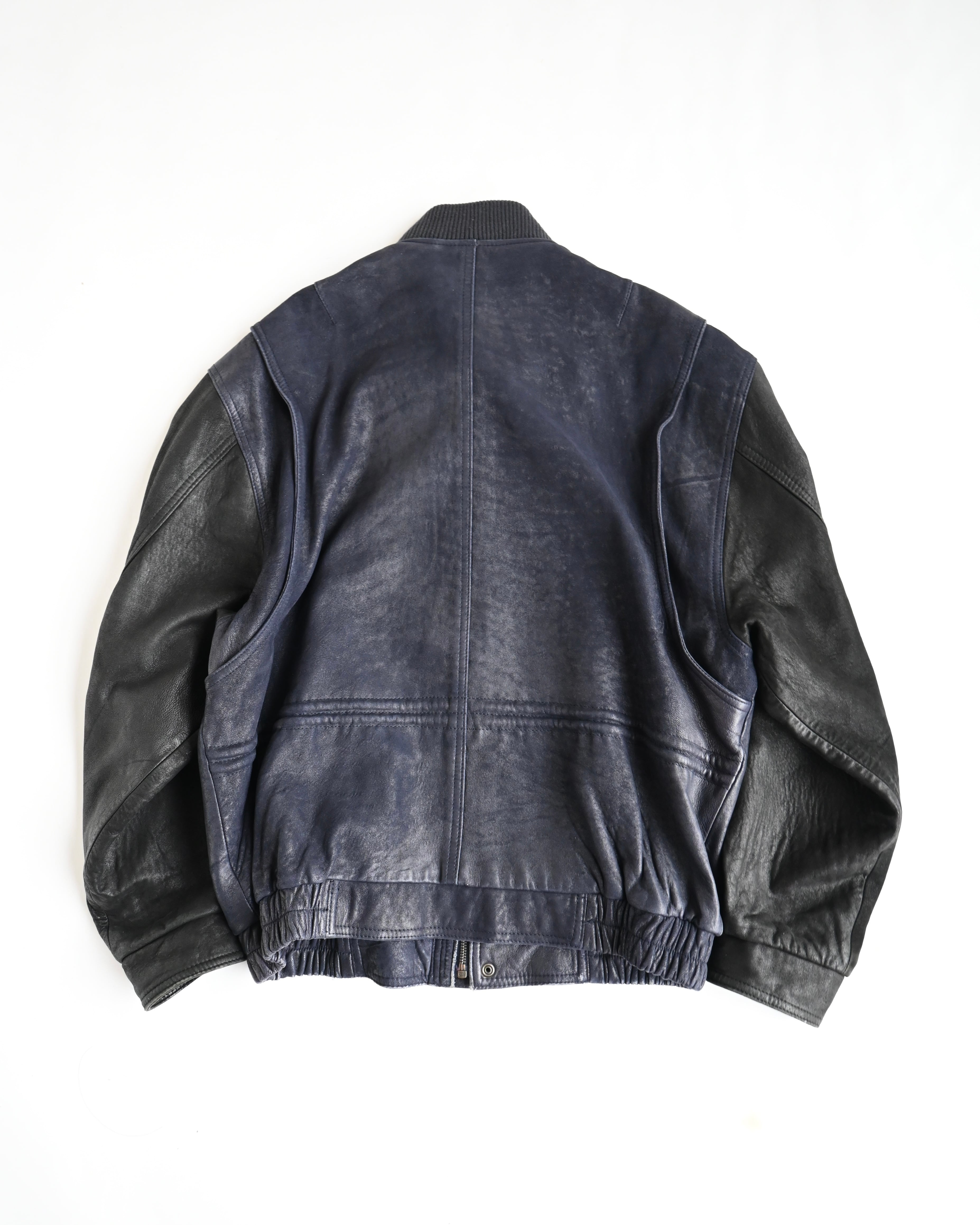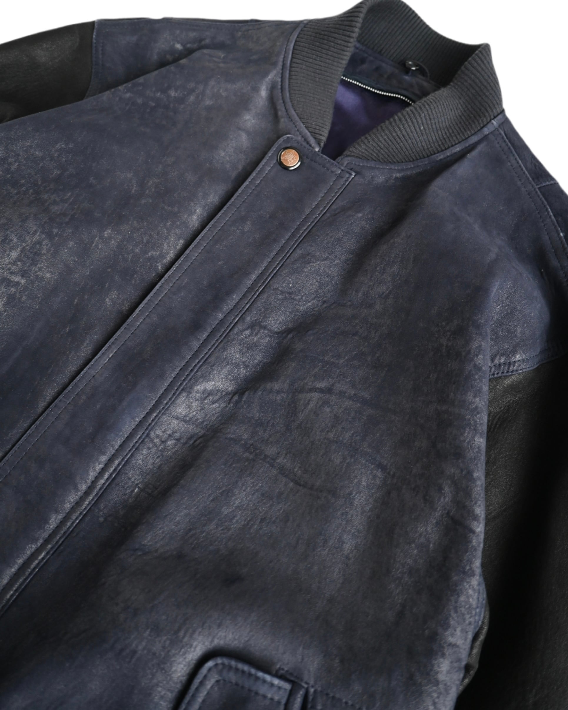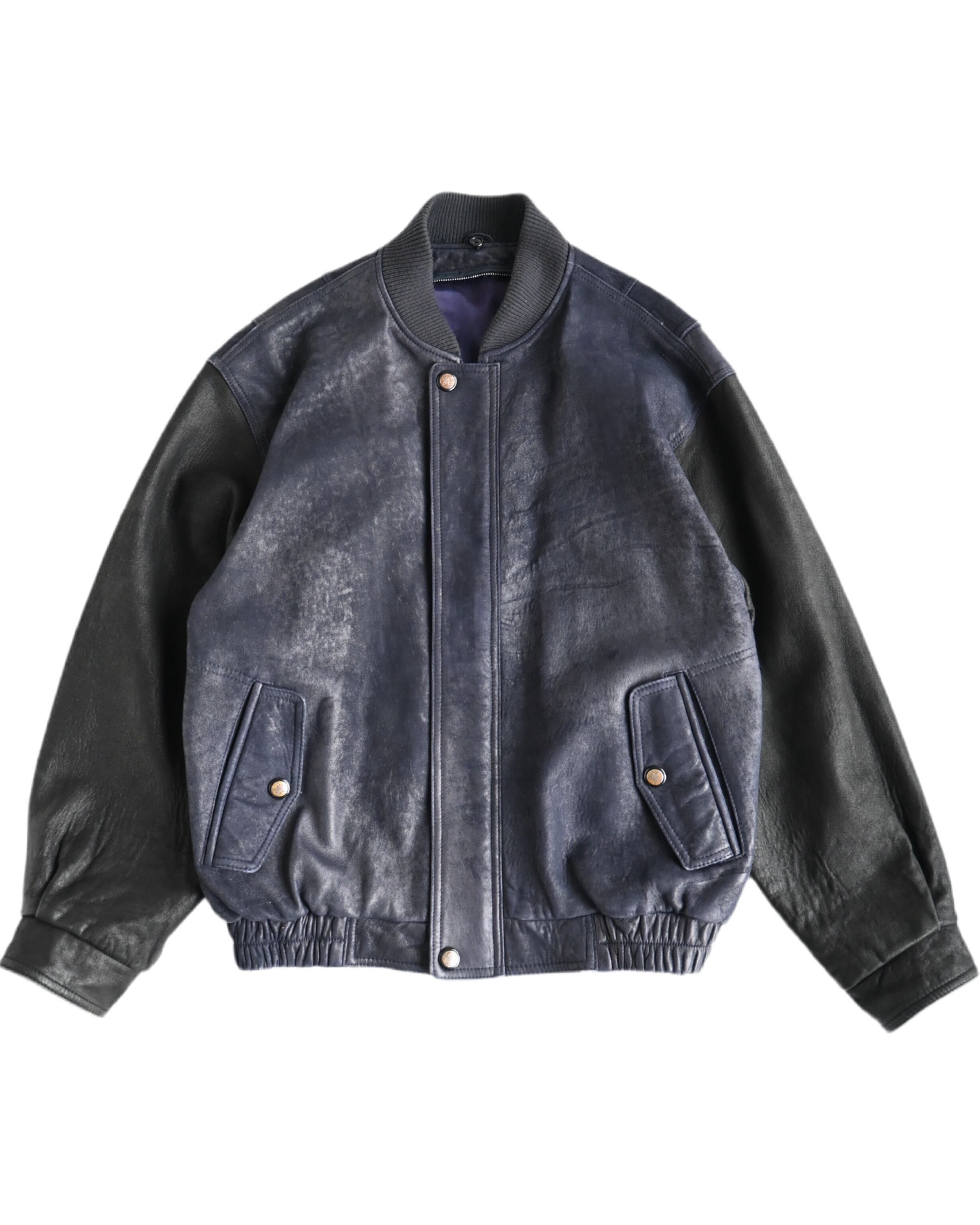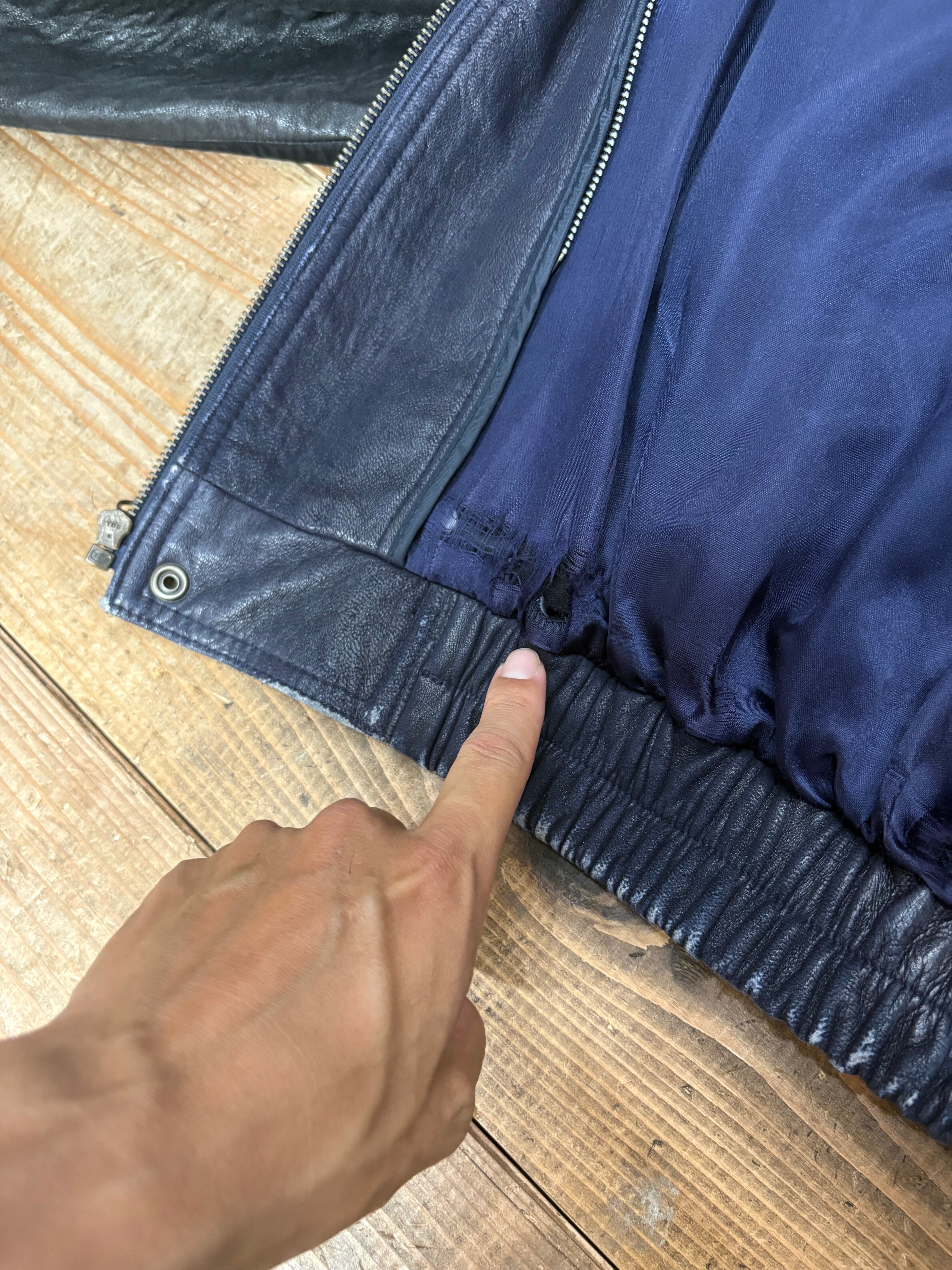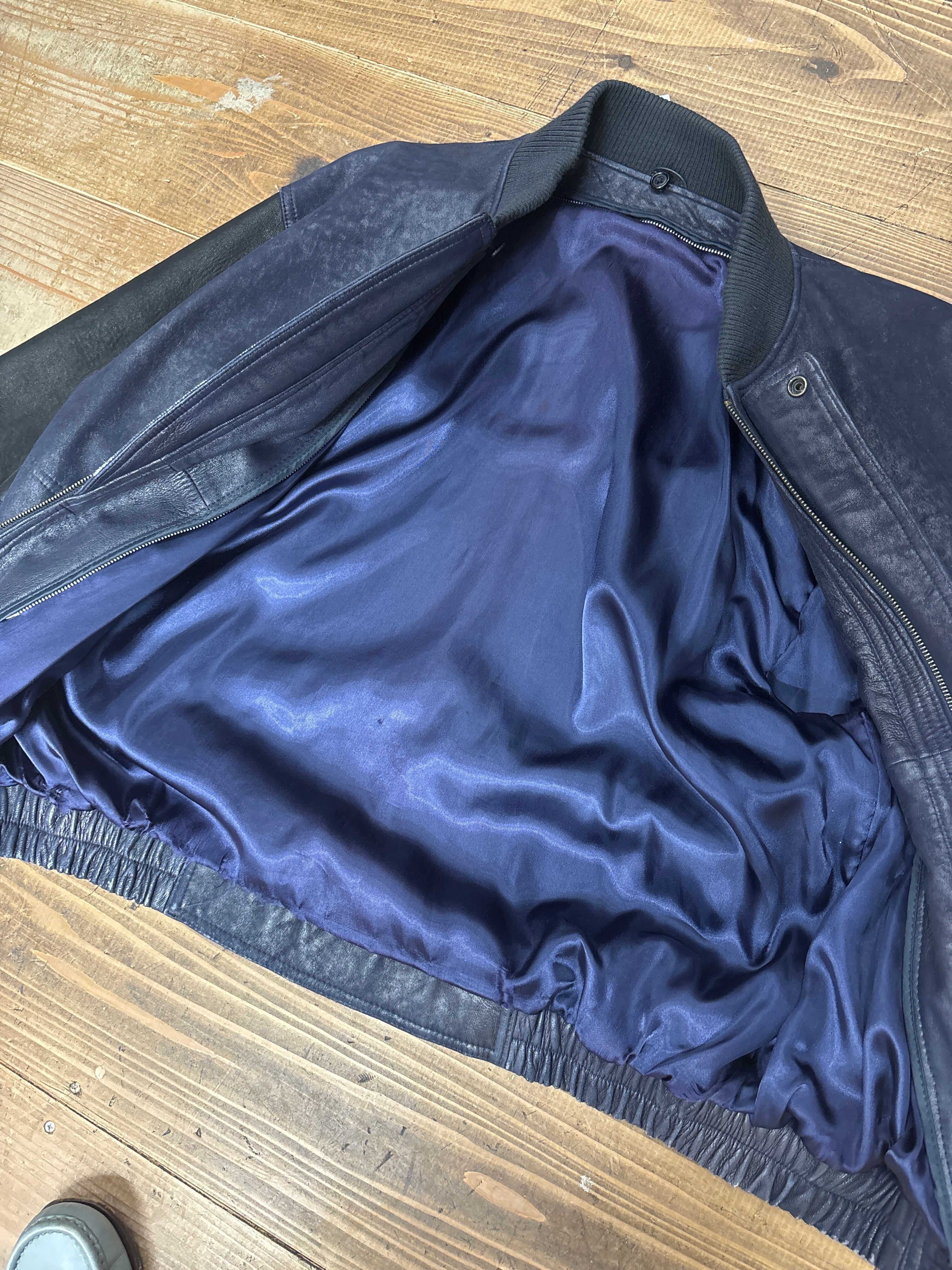 ロンドンフォグのレザーボンバージャケット。ネイビー×ブラックの配色はまるで現行のブランドが作ったかのよう。恐らくシルクサテンの裏地を使用。ライナー欠損、裏地に破れあり。