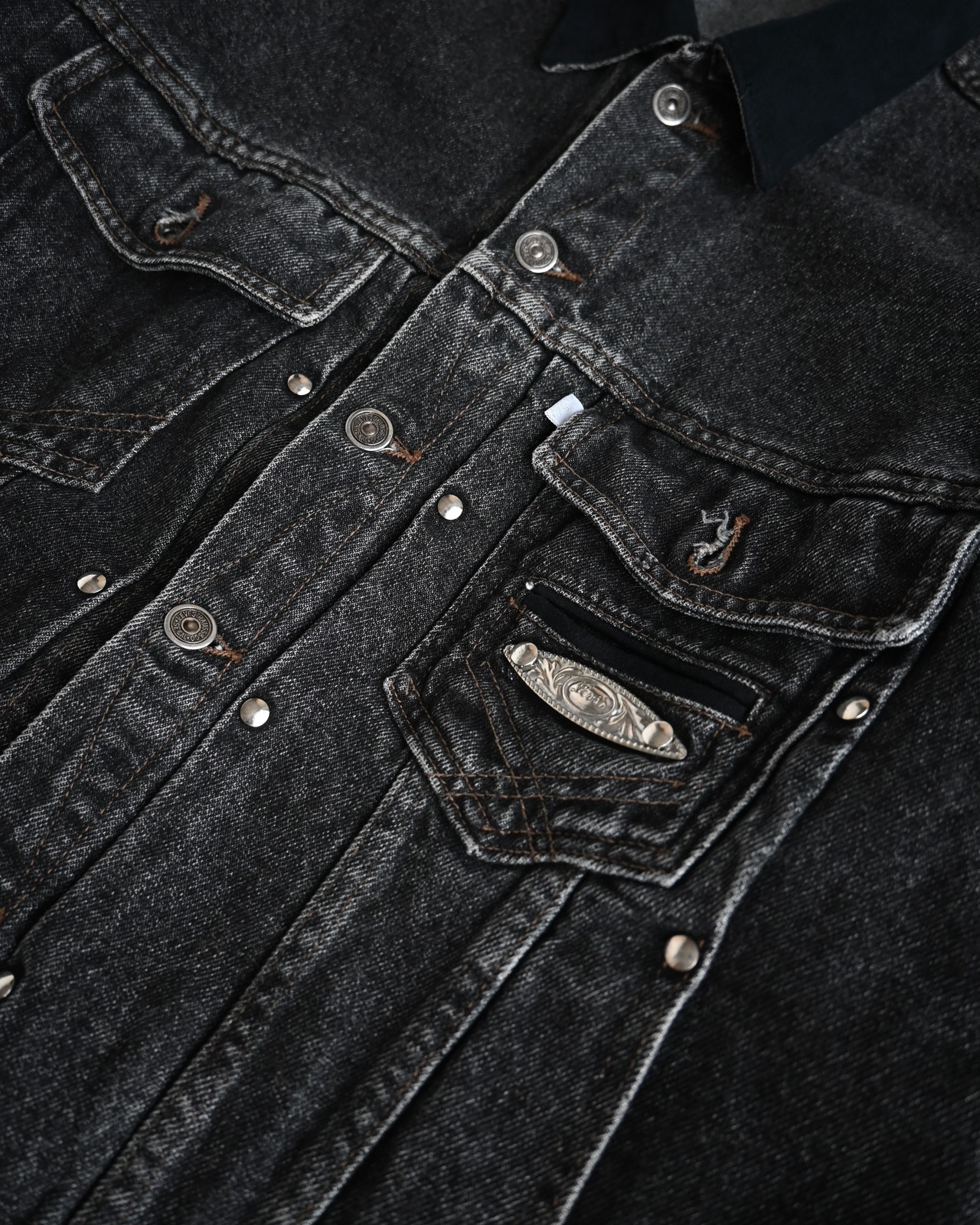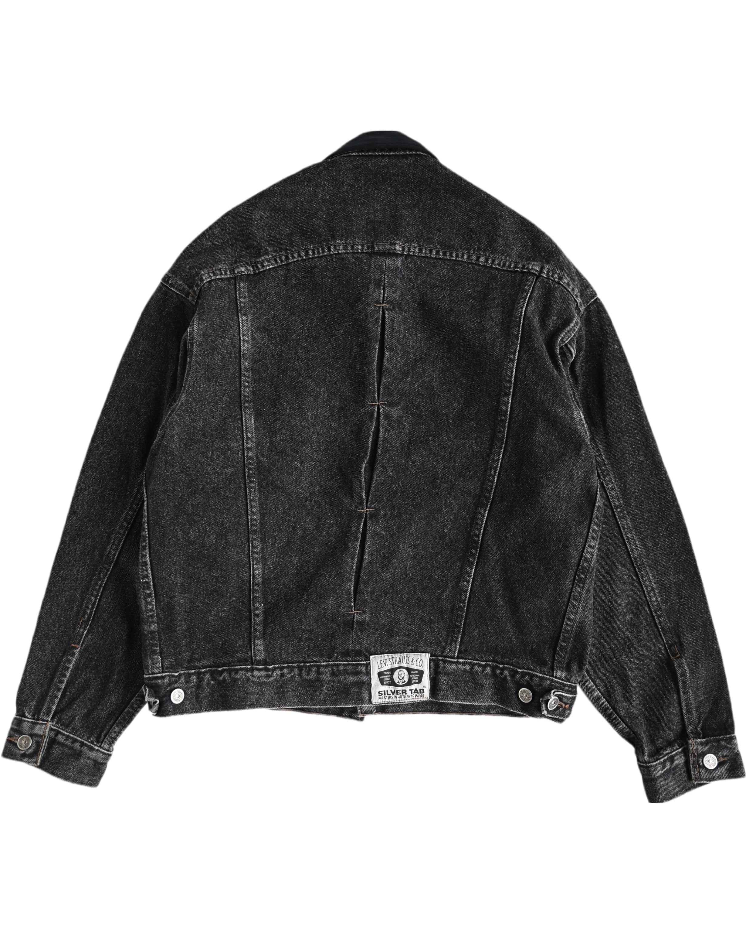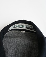 usa製シルバータブの先染めブラックデニムジャケット。ラングラーの様なディテールにバックのジャックナイフプリーツは唯一無二。襟はフェイクスエード。M表記ですが173/64でゆとりを持って着用できます。GOOD CONDITION