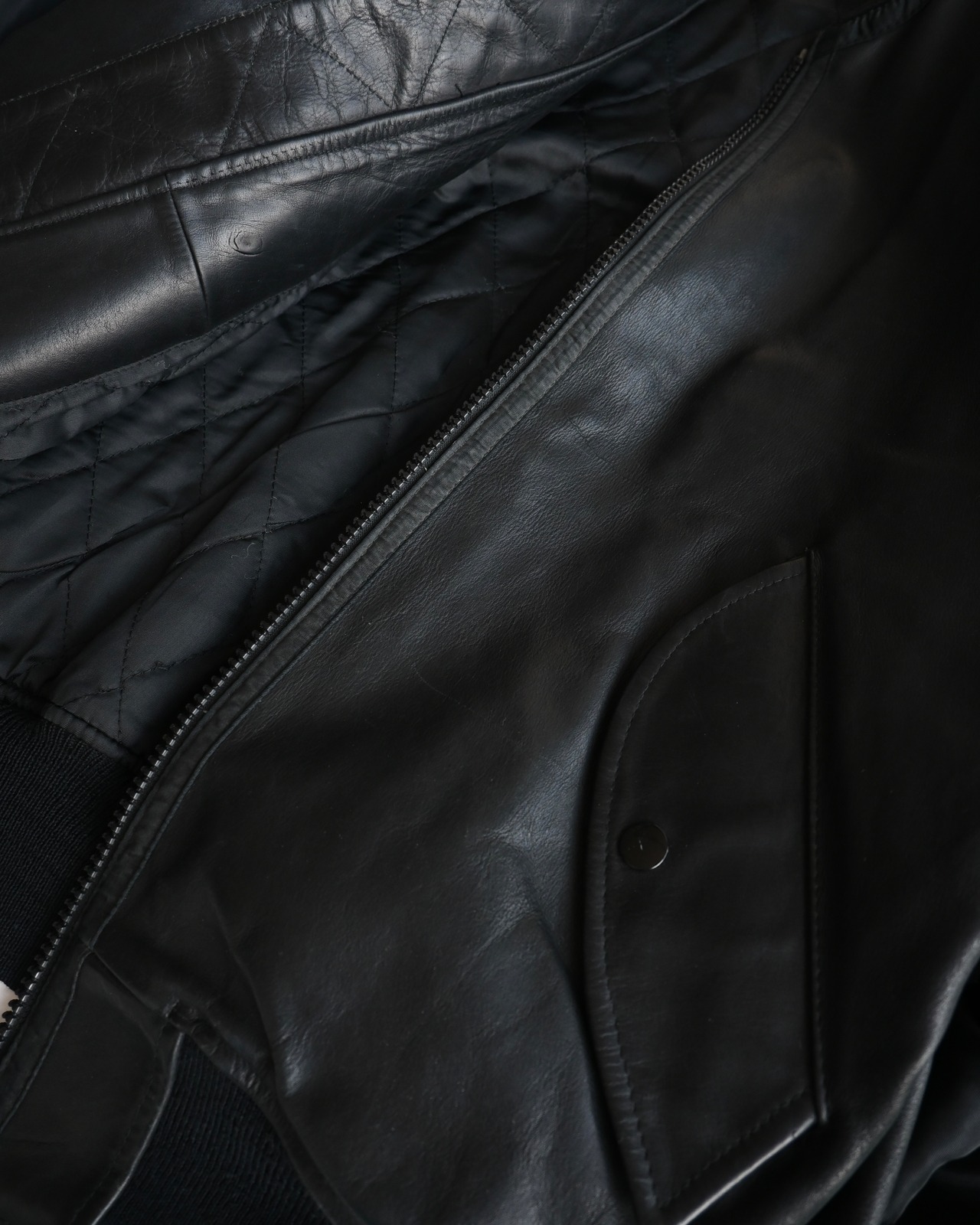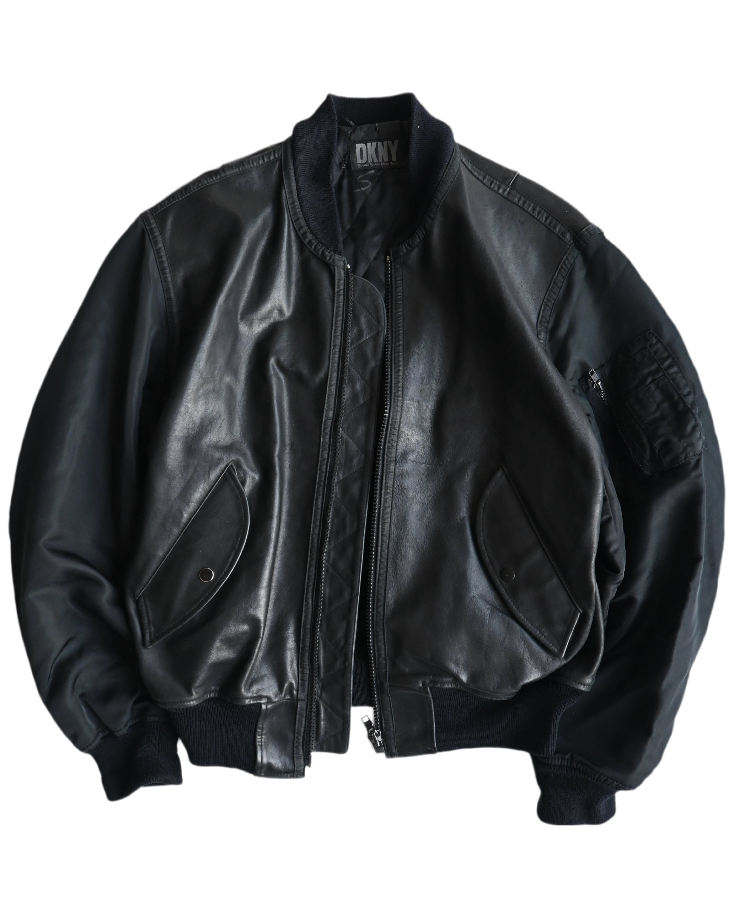 ダナキャランのボンバージャケット。ナイロン切り替えてレザーボンバーは中々見つからないかと。右ポケットの袋布が欠損。目立った傷や汚れなし。